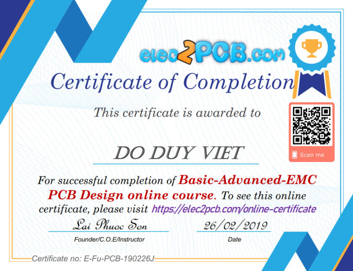 Để nhận được giấy chứng nhận, học viên hoặc người mua video phải gửi một bài mạch bất kỳ trong các khóa học đến địa chỉ elec2pcb@gmail.com, nếu bài mạch đạt yêu cầu thì bạn sẽ nhận được giấy chứng nhận đã hoàn thành tốt khóa đó. Ví dụ với khóa FULL PCB như sau:
