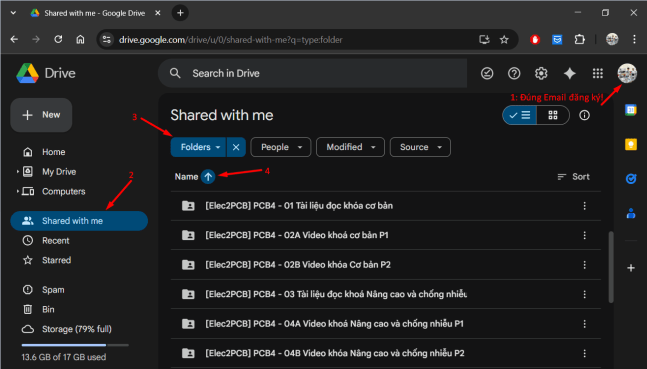 Bạn truy cập vào Google Drive – Đến mục “Share with me” sẽ thấy các folder tài liệu và video được share đến bạn đã có trong đó! Bạn có thể xem thêm bài viết “Mẹo quản lý thư mục tài liệu và video trong các khóa học”