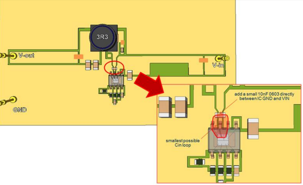 Với bài viết này, hy vọng sẽ giúp ích cho các bạn thiết kế phần cứng cũng như layout, xem xét thật kỹ việc đặt tụ điện lọc nguồn Vin thật gần chân Vin của IC. Đồng thời xem xét khả năng tạo ra cộng hưởng giữa tụ Vin với điện cảm ký sinh để thêm hay không thêm một tụ điện song song khác nữa. Với cách làm như vậy sẽ loại bỏ được nhiễu vọt lố, nhiễu gợn, nhiễu cộng hưởng và làm giảm bức xạ điện từ về mức nền cho những khối mạch chuyển mạch nguồn (mạch nguồn xung).