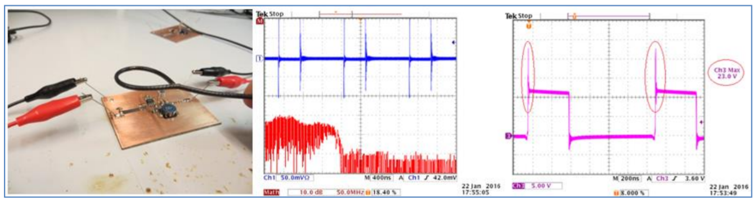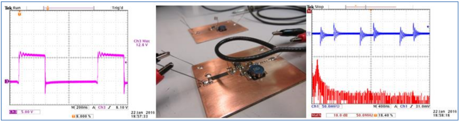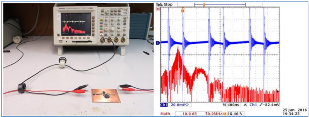 Dùng đầu dò bức xạ điện trường, ta thấy dạng sóng chuyển mạch (switching waveform) có nhiều vọt lố lớn và nhiễu gợn (big overshoot and ringing ).