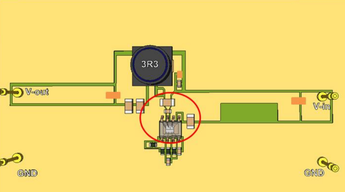 Nhiễu này là kết quả của cộng hưởng giữa tụ mới lắp 10nF (0603) với điện cảm ký sinh của vật dẫn 4nH (cho 3mm vật dẫn song song với tiếp xúc của tụ điện lên PCB) tạo ra một đáp ứng tần số 25MHz. Giải pháp là chúng ta có thể thêm một tụ lớn hơn 22uF (1206) song song với tụ 10nF (0603) như layout hình bên dưới.