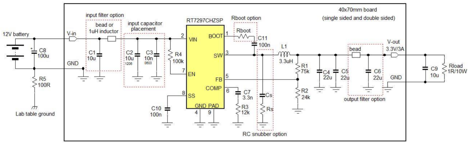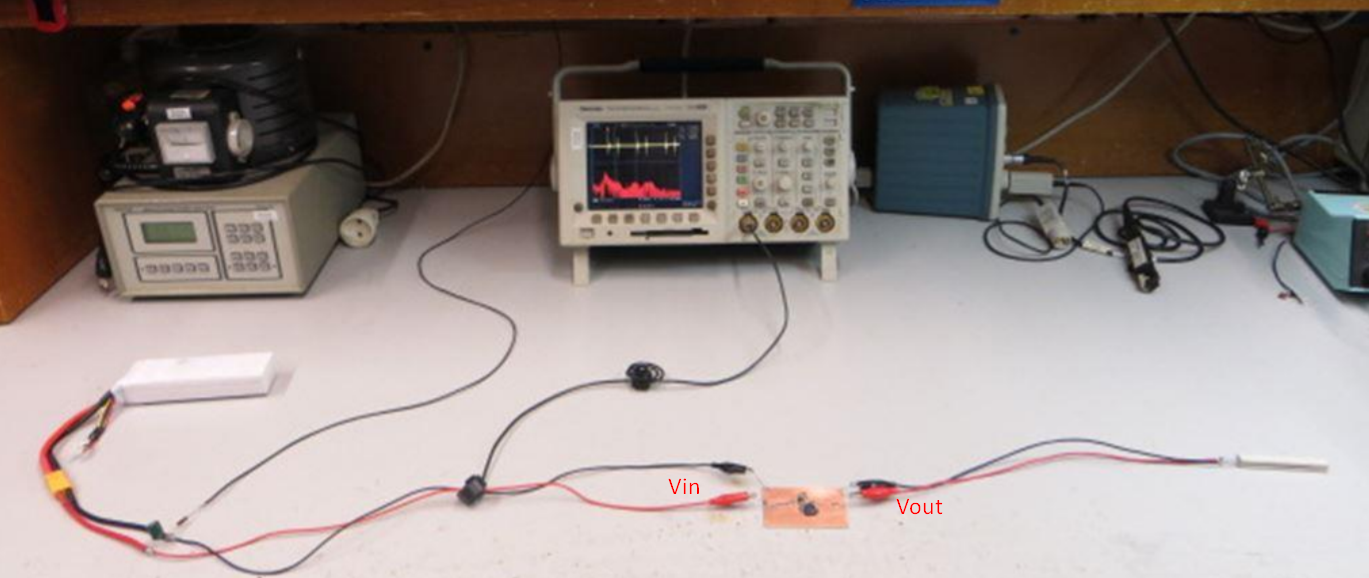 Một tụ điện sẽ mắc song song tại nguồn vào để giảm hiện tượng cộng hưởng do nguồn pin có cuộn cảm ký sinh. Tải là một mô hình tương đương với 1 trở 1 ohm song song với một tụ 10uF (micro Fara). Mạch này có thể cung cấp cho tải một dòng 3A với trở kháng thấp cho tần số cao. Đầu GROUND của dây Vin được nối với trở 100 ohm nối tiếp với bàn hoặc tường phòng hoặc sàn nhà ngay tại chỗ làm thí nghiệm, để tạo một tham chiếu đất.