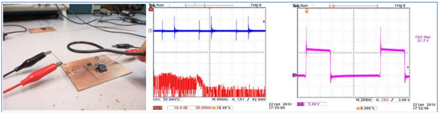 Trong nghiên cứu này, một máy phân tích phổ và hiện sóng sẽ được sử dụng, một đầu đo được đo tại dây nguồn cung cấp vào (Vin=12VDC).