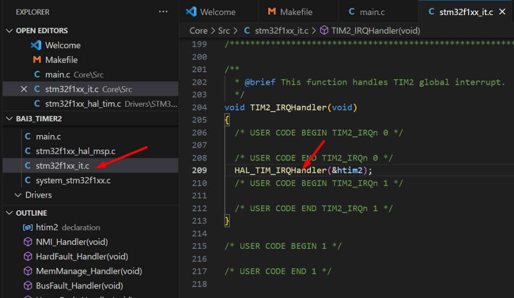 Các bạn tìm đến file stm32f1xx_it.c có hàm thực thi ngắt Timer2, đó là hàm TIM2_IRQHandler.