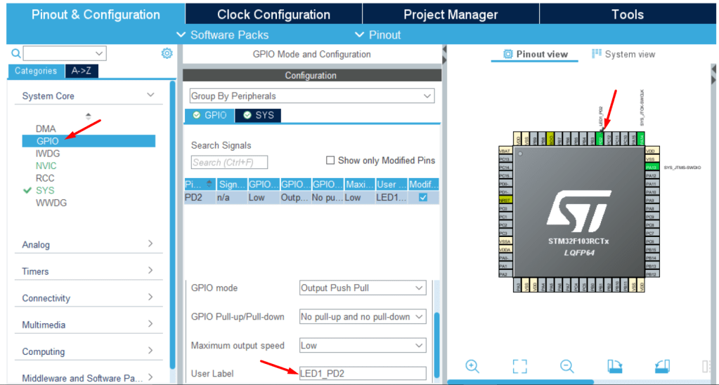 Tiếp theo mình chọn chân kết nối với đèn LED là PD2, kích chuột trái tại chân PD2 chọn là GPIO_Output và đặt tên gợi nhớ là LED1_PD2 tại mục Configuration.