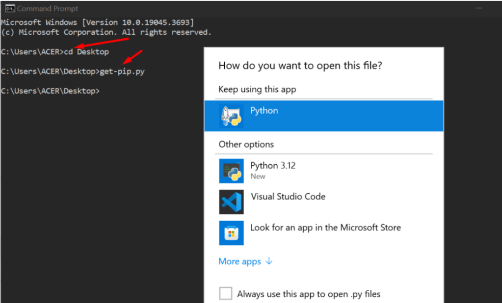 Các lệnh đó là: python get-pip.py và python -m pip install -U pip