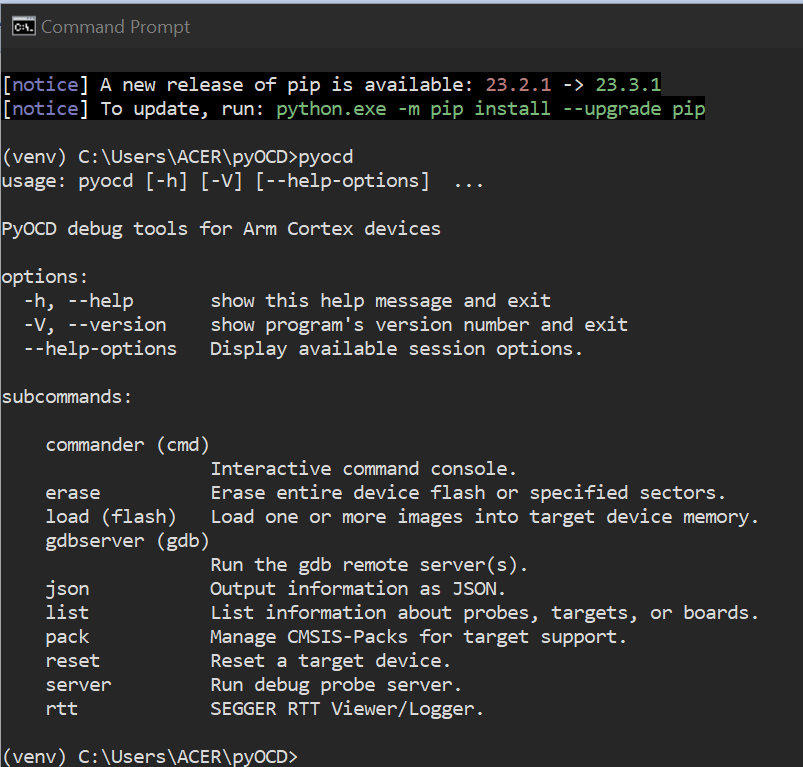 Bây giờ chúng ta có thể cài đặt pyOCD bằng lệnh sau:
