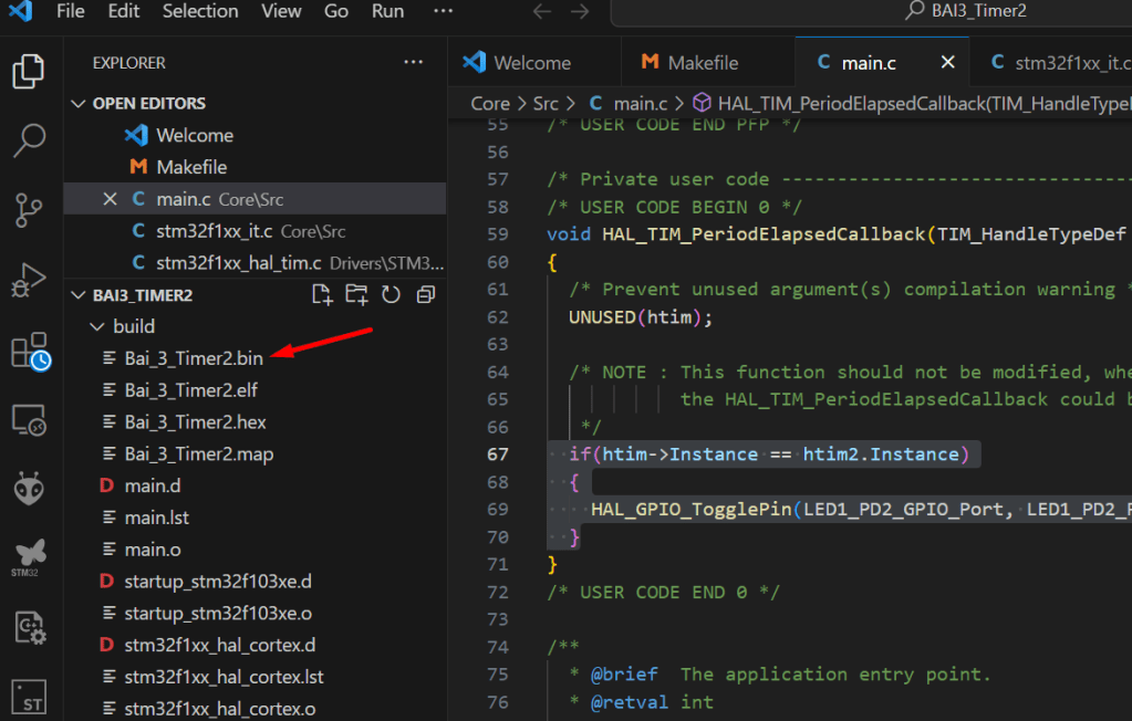Sau đó dán vào khu vực tiền xử lý trên hàm main() trong main.c và có thêm đoạn chương trình để đảo trạng thái LED khi có sự kiến ngắt timer2.