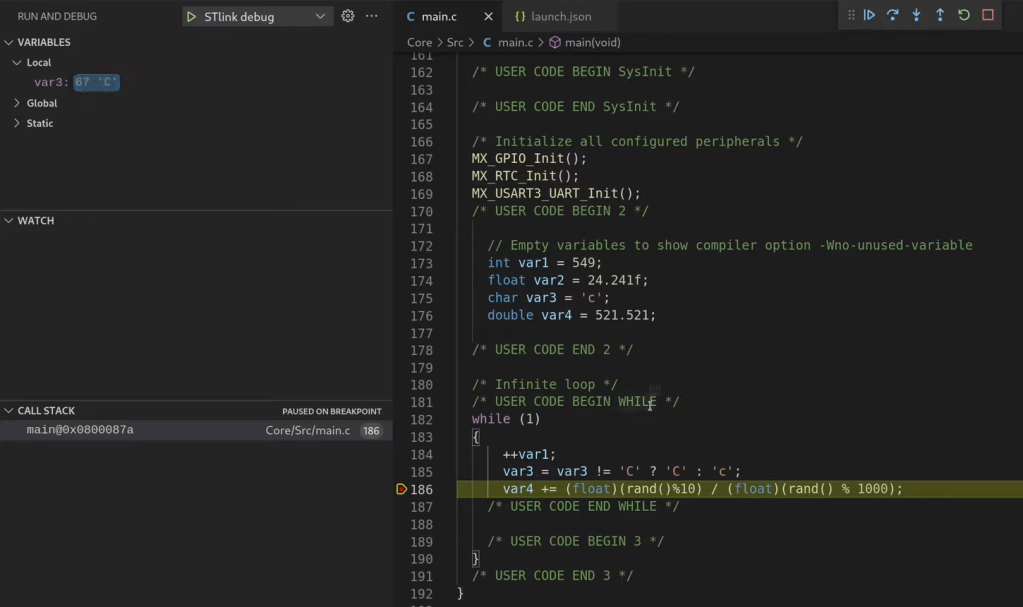 Bạn có thể debug bằng cách bấm vào thẻ Debug STM32 ở trên, và sau đó tiến hành các thao tác debug như bình thường.