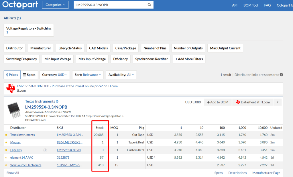 Sau khi đã chọn được linh kiện, thì bước tiếp theo là tìm nơi mua được linh kiện, nếu không mua được thì cần chọn lại linh kiện với giá trị khác cho phép. Trong nước thì các bạn tìm các trang bán linh kiện để kiểm tra còn hàng không? Ngoài nước thì mình hay vào trang https://www.digikey.com/ để tìm linh kiện mà mình cần. Nếu linh kiện mà mình tìm hết hàng hoặc mình muốn so sánh giá ở các trang khác thì vào trang https://octopart.com/